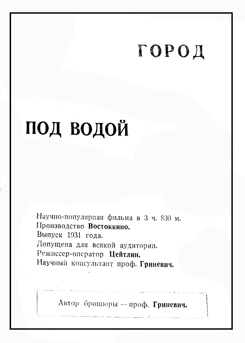 В 1932 г. в Москве К. Э. Гриневич издает научно-популярную брошюру «Город под водой: Развалины Херсонеса. Кинолибретто и методические указания к беседе». Брошюра состояла из двух разделов. В первом кратко рассказывается история изучения Херсонеса, обосновывается необходимость в подводных исследованиях и дается описание технической стороны вопроса. Вторая часть «Работа вокруг фильмы» содержит рекомендации по организации беседы со зрителями перед просмотром и перечень научно-популярных лекций, дополняющих материал фильма: «Предлагаемый вниманию зрителя фильма «Город под водой» требует, как всякая научная фильма, предварительных пояснений». Лектору рекомендуется осветить темы «Античное рабовладельческое общество и черноморские колонии», «Греческая колонизация и причины возникновения главных греческих городов Причерноморья – Херсонеса, Пантикапеи и Ольвии», «Почему происходят случаи поглощения земли морем?», «Исторические факты провалов суши. Как объясняют геологи эти природные явления», «Победа научной мысли в СССР». Гриневич утверждает, что «Проведенная в 1931 году работа свидетельствует о победе научной мысли в СССР. Она показывает, что только в стране строящегося социализма, в противоположность к капиталистическим странами имеются предпосылки для свободного и победоносного развития науки» [26, с. 6–7].