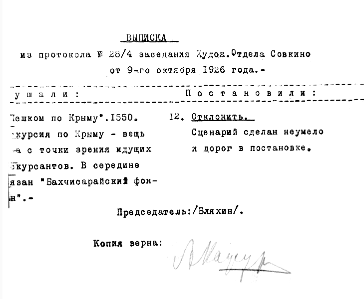 Выписка из протокола заседания художественного отдела «Совкино» о фильме «Пешком по Крыму», 1926 г.