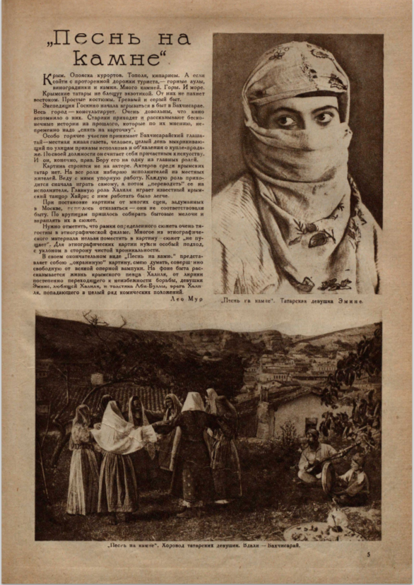 В Крымской АССР наибольшее внимание кинематографистов привлекала культура, искусство и быт крымских татар. Одним из первых советских фильмов о крымских татарах является «Песнь на камне», снятый Госкино в 1926 г. Создателями картины выступили известные деятели советского кинематографа. Руководителем картины выступил советский кинорежиссёр, сценарист и актёр Лео Мур (Леонтий Игнатьевич Мурашко) (1889–1938), автором сценария выступил советский кинокритик, писатель и драматург Хрисанф Николаевич Херсонский (1897–1968), кинооператором Григорий Владимирович Гибер (1891–1951). Главную роль исполнил знаменитый актёр театра и кино, народный артист Крымской АССР Хайри Эмир-Заде (1893–1958). В центре сюжета – судьба певца-бунтаря Халила, чей персонаж объединял в себе образы легендарных национальных героев поэта Ашик-Умера и разбойника Алима Айдамака.